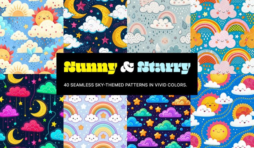 Brighten up your designs with Sunny & Starry, a vibrant collection of 40 seamless sky-themed patterns created to add charm and whimsy to any project. Designed in a playful, kiddy style, these patterns are bursting…